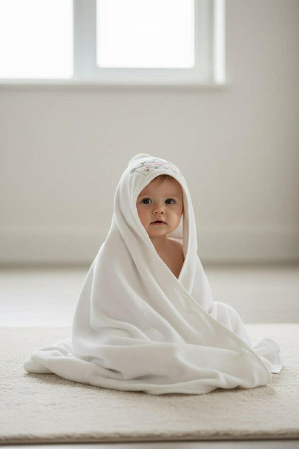 Η βρεφική πετσέτα με κουκούλα είναι ιδανική για το μπάνιο του μωρού, προσφέροντας απαλό και άνετο στέγνωμα.