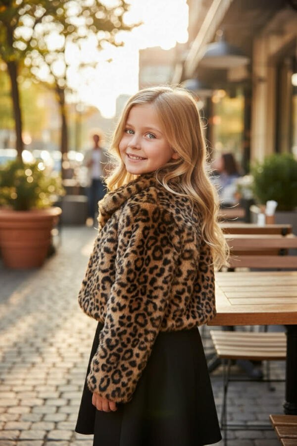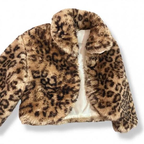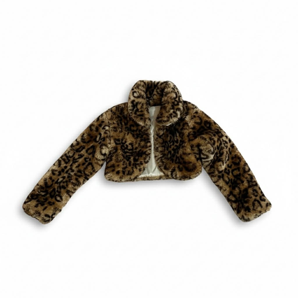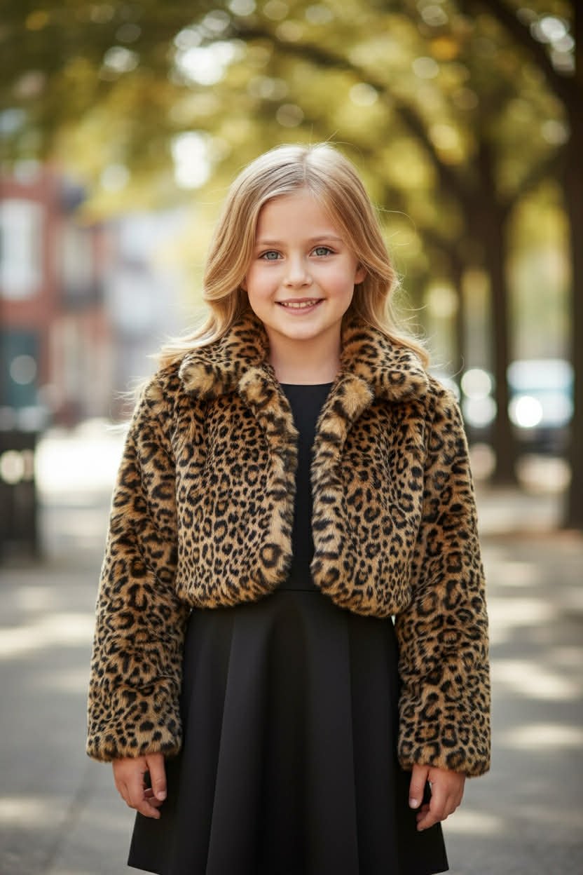 Ένα κομψό και ζεστό παιδικό μπολερό σε λεοπάρ γούνινη υφή, σχεδιασμένο για να δίνει στυλ σε κάθε εμφάνιση.