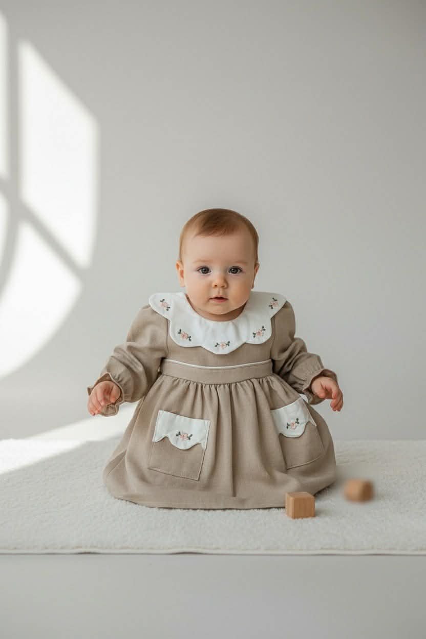 Κομψό βρεφικό φόρεμα από ύφασμα λινό-βαμβάκι, με βαμβακερή φόδρα για άνεση και φιλική αίσθηση στο δέρμα. Ξεχωρίζει με τον γιακά γκιπούρ και τις διακριτικές κεντητές λεπτομέρειες, ενώ το άνετο κόψιμο επιτρέπει ελευθερία κινήσεων. Ιδανική επιλογή για καθημερινές εμφανίσεις αλλά και για ιδιαίτερες περιστάσεις, όπως γιορτές, επισκέψεις και φωτογραφίσεις.
