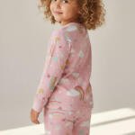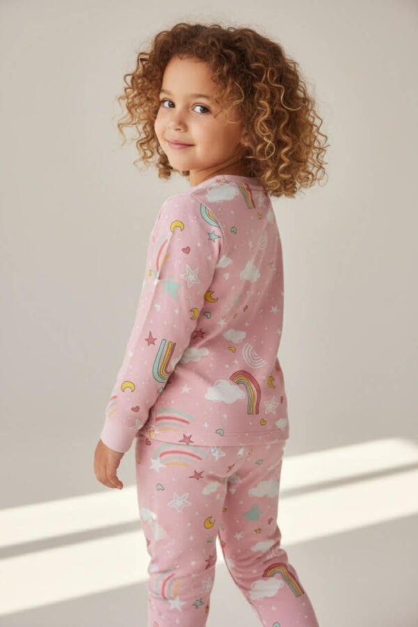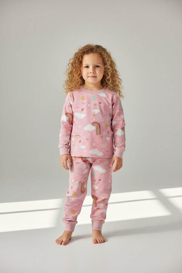 Παιδική πιτζάμα δύο τεμαχίων με χαρούμενα μοτίβα ουρανού (ουράνια τόξα, σύννεφα, αστέρια), ιδανική για άνετο και ξεκούραστο ύπνο.