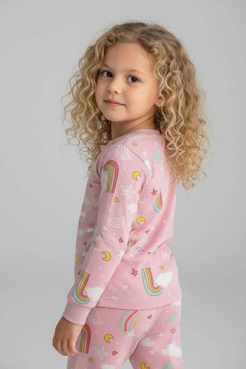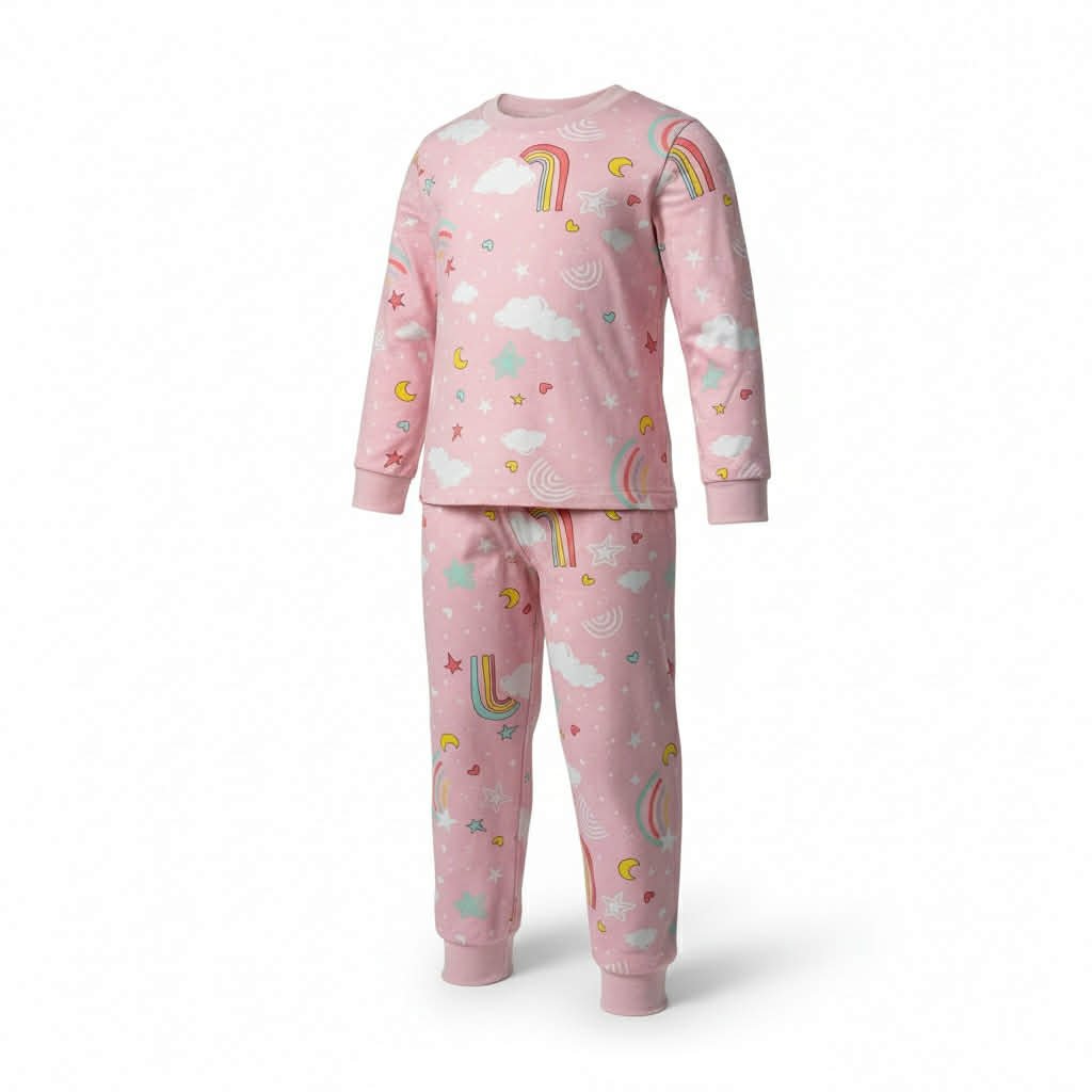 Παιδική πιτζάμα δύο τεμαχίων με χαρούμενα μοτίβα ουρανού (ουράνια τόξα, σύννεφα, αστέρια), ιδανική για άνετο και ξεκούραστο ύπνο.