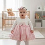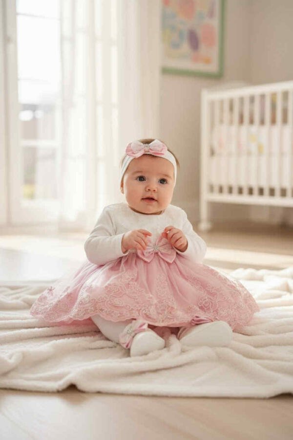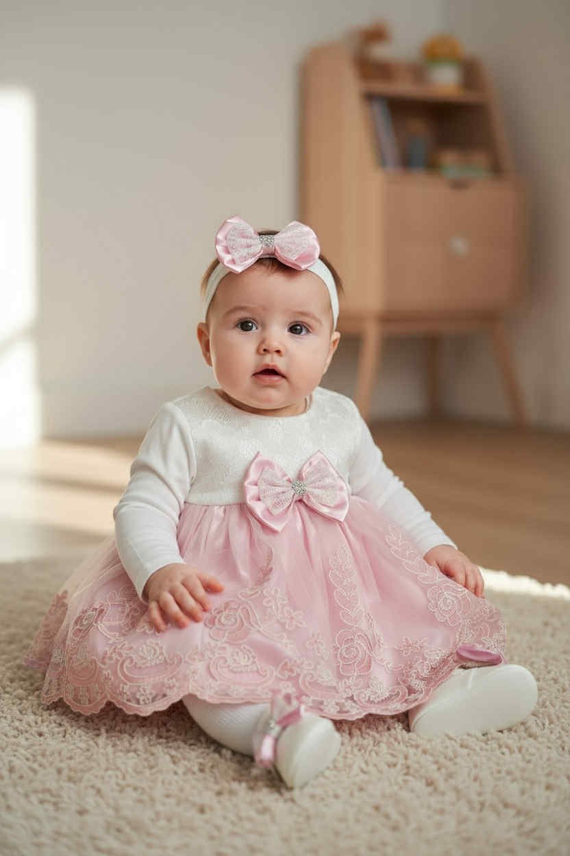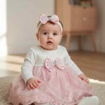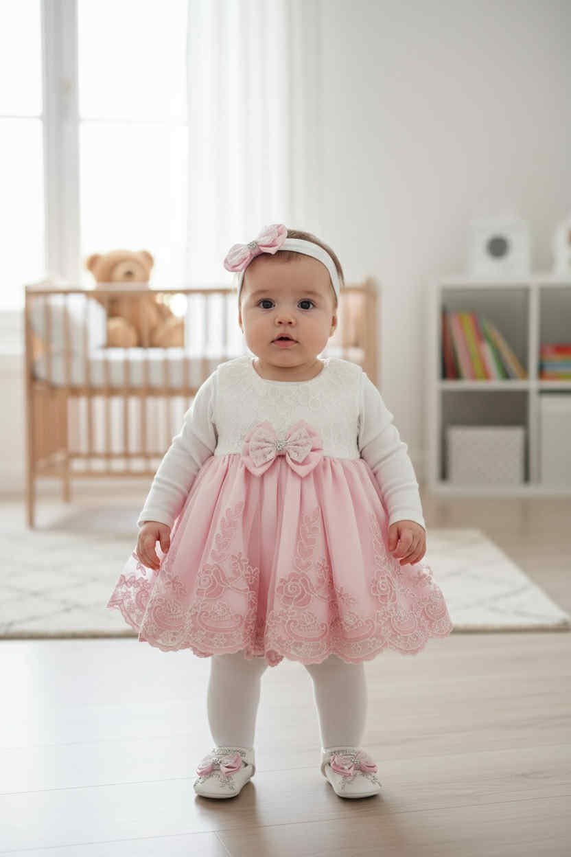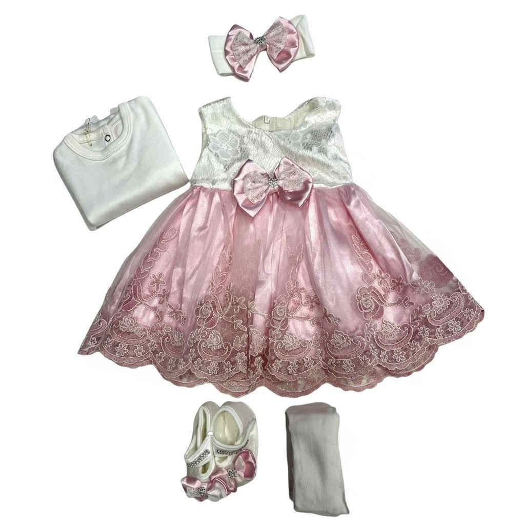 Περιλαμβάνει δαντελένιο φόρεμα με βαμβακερή φόδρα, μακρυμάνικο φορμάκι, μάλλινο καλσόν και παπουτσάκια από βαμβακερό σατέν ύφασμα τύπου babywalker.