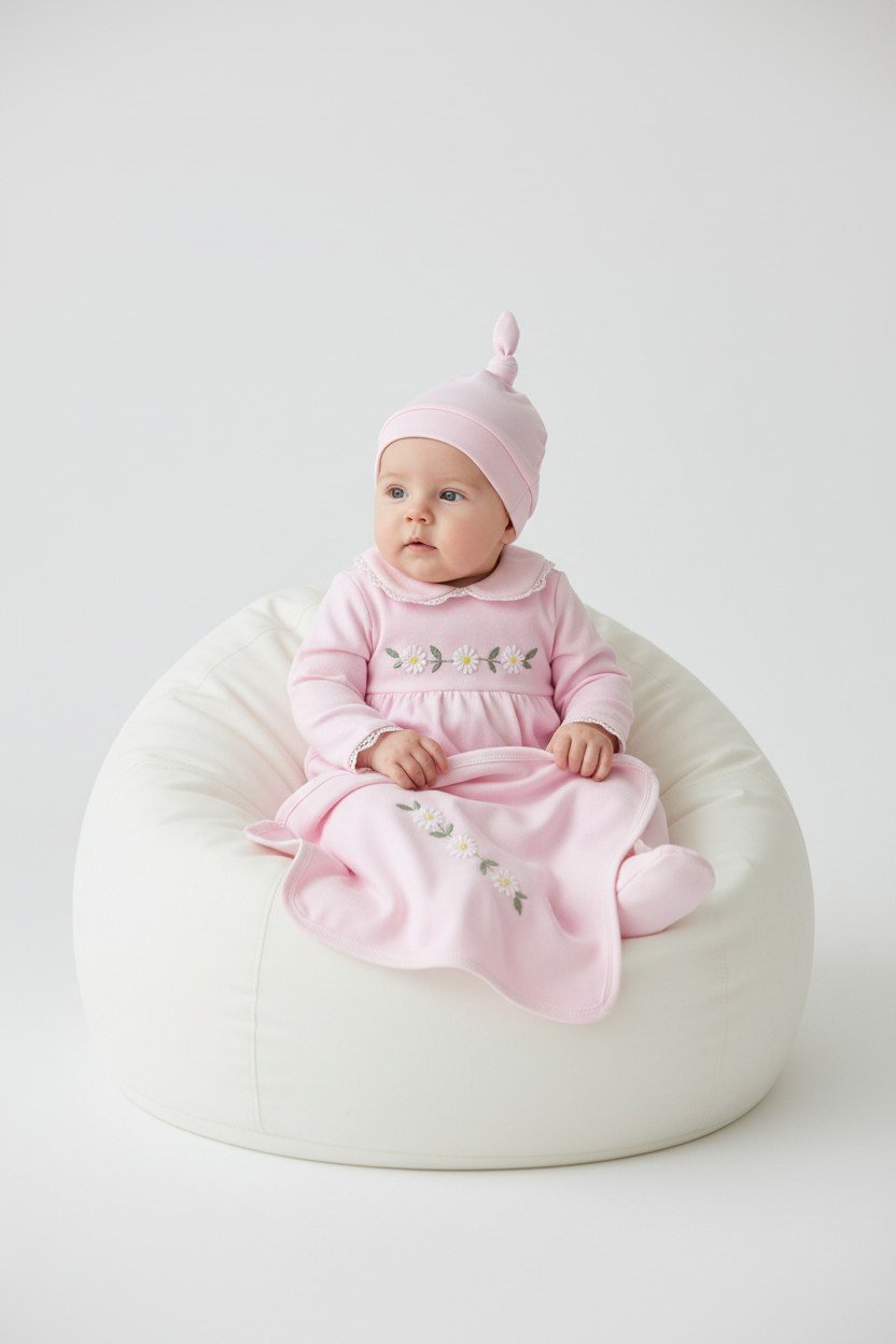 Γλυκό και πρακτικό σετ νεογέννητου 7 τεμαχίων με διακριτικό λουλουδάτο σχέδιο (μαργαρίτες), ιδανικό για τις πρώτες εβδομάδες του μωρού. Είναι φτιαγμένο από 100% βαμβάκι, με απαλή υφή και καλή διαπνοή, ώστε να προσφέρει άνεση και φροντίδα στο ευαίσθητο βρεφικό δέρμα.