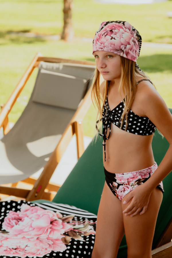 UPF 50+ αντιηλιακή προστασία. Με αποκλειστικά τυπώματα της εταιρείας CL. Το μπικίνι αποτελείται από τρία κομμάτια: ένα τοπ και δύο κάτω μέρη — το ένα πουά και το άλλο λευκό.