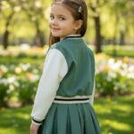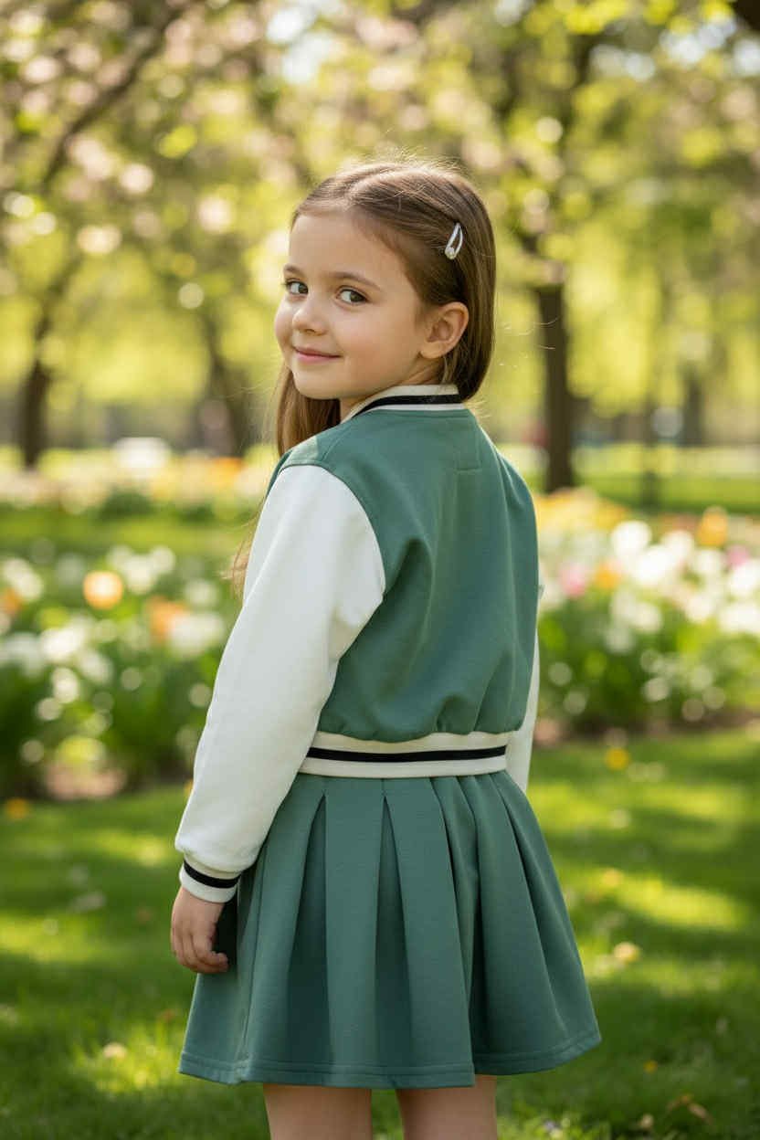 Το σετ περιλαμβάνει ζακέτα τύπου bomber, μακρυμάνικη μπλούζα και πλισέ φούστα.