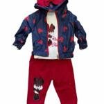 Σετ τριών τεμαχίων, με αξεσουάρ φιόγκο στην κουκούλα του μπουφάν, αδιάβροχο, μακρυμάνικη βαμβακερή μπλούζα και παντελόνι με ελαστική μέση. Μπορεί να φορεθεί τον χειμώνα, το φθινόπωρο και την άνοιξη.