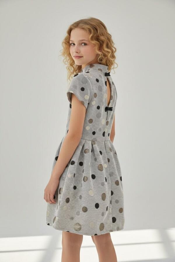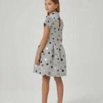 Κομψό φόρεμα “Chef” από λεπτό ριπ βαμβακερό ύφασμα, σε ασπρόμαυρη/γκρι βάση με λαμπερές πουά λεπτομέρειες. Στο κάτω μέρος της φούστας υπάρχει μία στρώση μαύρο τούλι και από κάτω βαμβακερή φόδρα. Είναι πάνω από το γόνατο, με άνετη γραμμή και ιδιαίτερο design στην πλάτη: η πίσω περιοχή διαθέτει άνοιγμα/σχισμή που ενώνεται με φιόγκους, δίνοντας ξεχωριστή και μοντέρνα αισθητική.