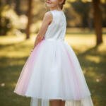 Η φούστα είναι πολύστρωμη από τούλι, με διακριτική ουρά στο πίσω μέρος που χαρίζει χάρη και κίνηση.