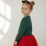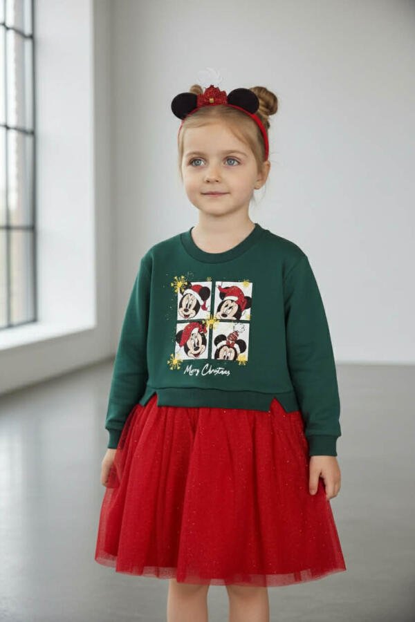 Το πάνω μέρος του φορέματος είναι μακρυμάνικο βαμβακερό φούτερ, ενώ το κάτω μέρος είναι κόκκινο τούλι με βαμβακερή φόδρα από κάτω. Το φόρεμα συνοδεύεται από αξεσουάρ για τα μαλλιά με κορδέλα