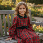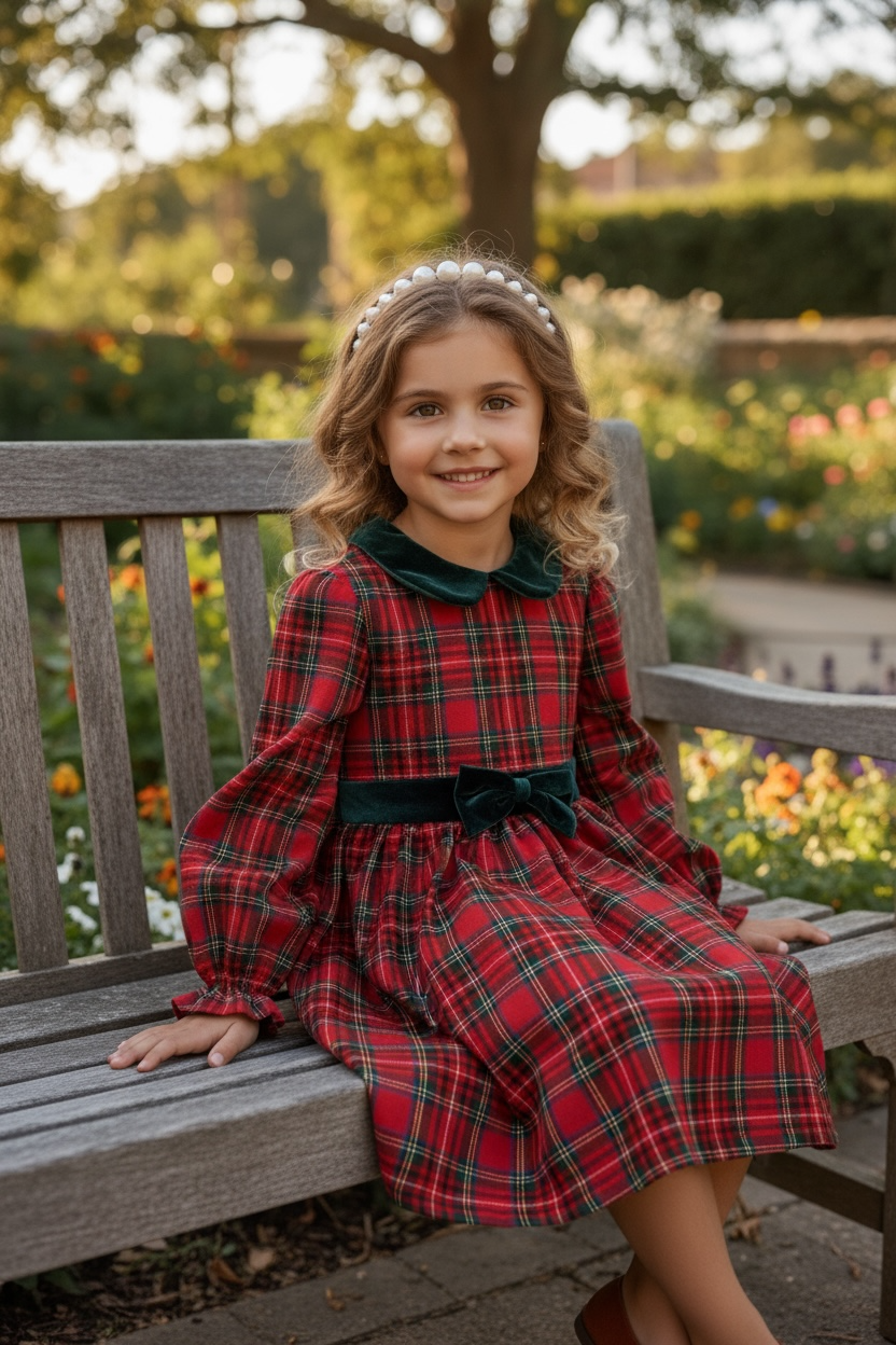 Το καρό φόρεμα έχει γιακά και ζώνη από βελούδινο ύφασμα. Διαθέτει φερμουάρ στο πίσω μέρος και η φούστα έχει επένδυση με τούλι στο κάτω μέρος.