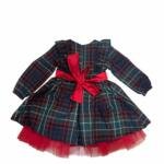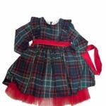 Το καρό φόρεμα διαθέτει σατέν ζώνη στη μέση. Έχει φερμουάρ στο πίσω μέρος και η φούστα περιλαμβάνει στρώσεις από τούλι που δίνουν όγκο, ενώ στο κάτω μέρος υπάρχει βαμβακερή επένδυση