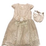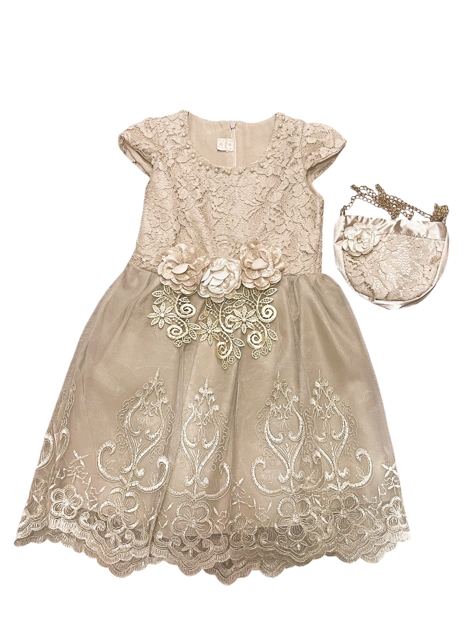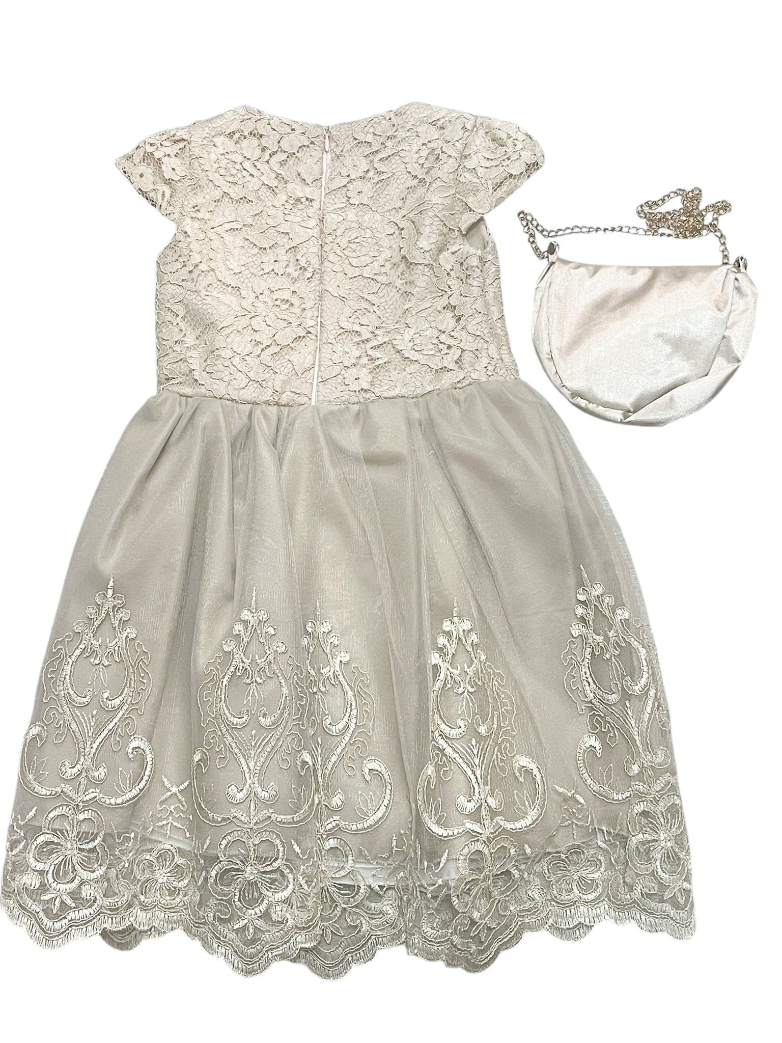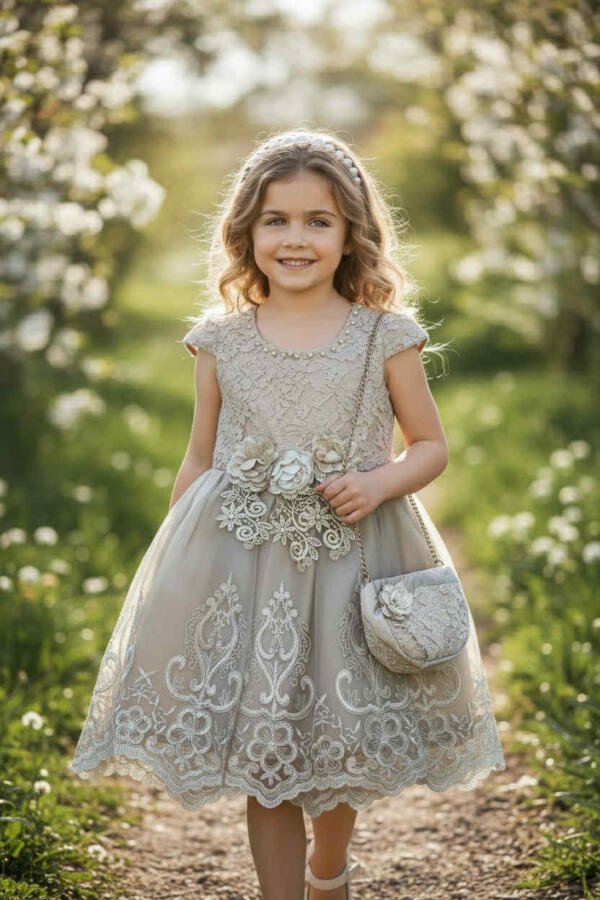 Το φόρεμα είναι από ύφασμα τούλι και σατέν, ενώ το μπούστο και η φούστα είναι διακοσμημένα με λεπτομέρειες από γκιπούρ και δαντέλα. Το φόρεμα διαθέτει φερμουάρ στο πίσω μέρος και είναι ραμμένο σύμφωνα με ευρωπαϊκές προδιαγραφές μεγεθών. Έχει βαμβακερή φόδρα στο εσωτερικό του. Η τσάντα ως αξεσουάρ είναι κατασκευασμένη από σατέν και διακοσμημένη με λεπτομέρειες από γκιπούρ