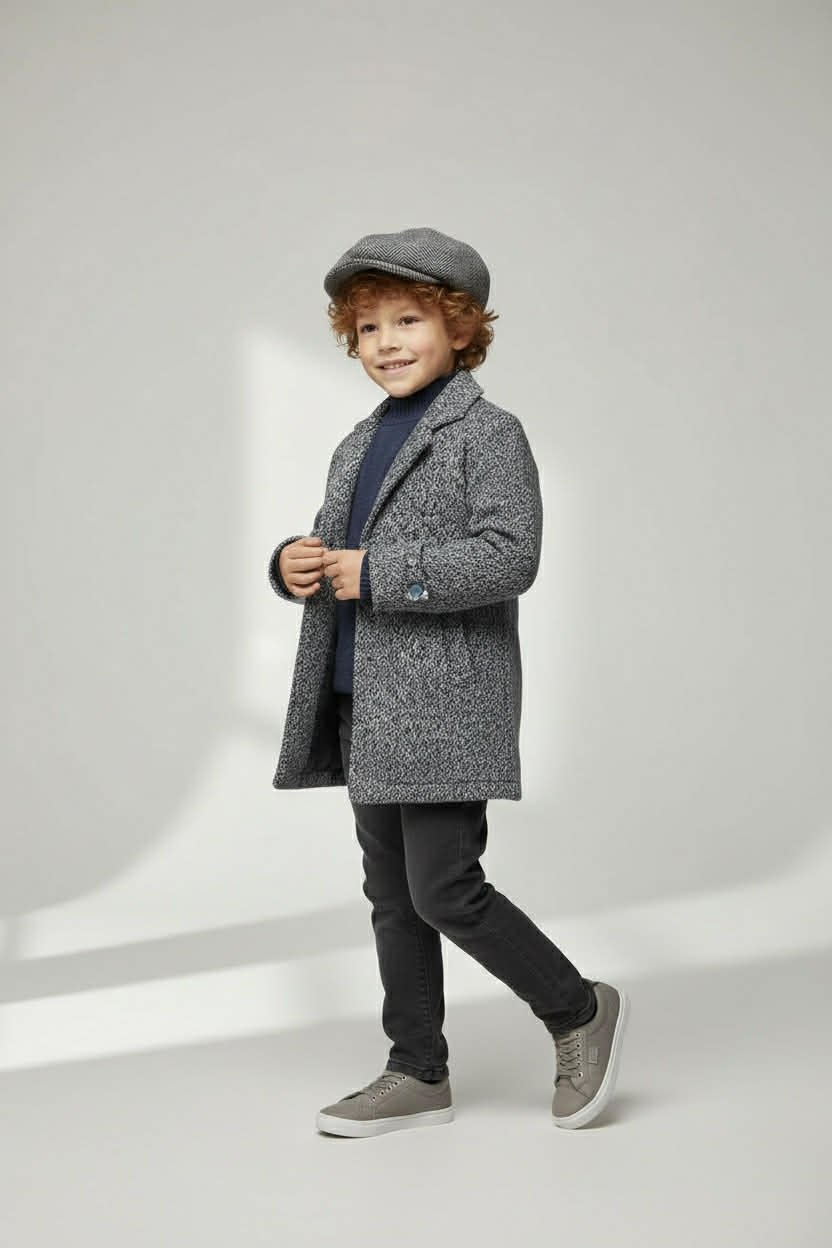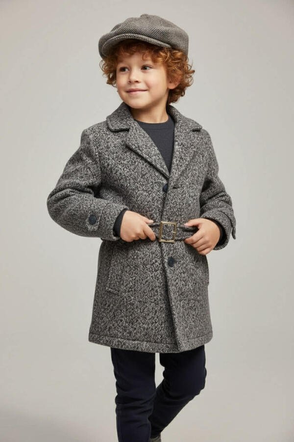 Κομψό σετ για αγόρι που περιλαμβάνει κοντό μάλλινο παλτό με ζώνη στη μέση, μπλε σκούρο πουλόβερ και μπλε σκούρο τζιν παντελόνι. Το παλτό διαθέτει εσωτερική επένδυση με γέμιση για περισσότερη ζεστασιά, ιδανικό για φθινόπωρο και χειμώνα, σε βόλτες αλλά και πιο επίσημες εμφανίσεις. (Το καπέλο δεν περιλαμβάνεται στο σετ.)