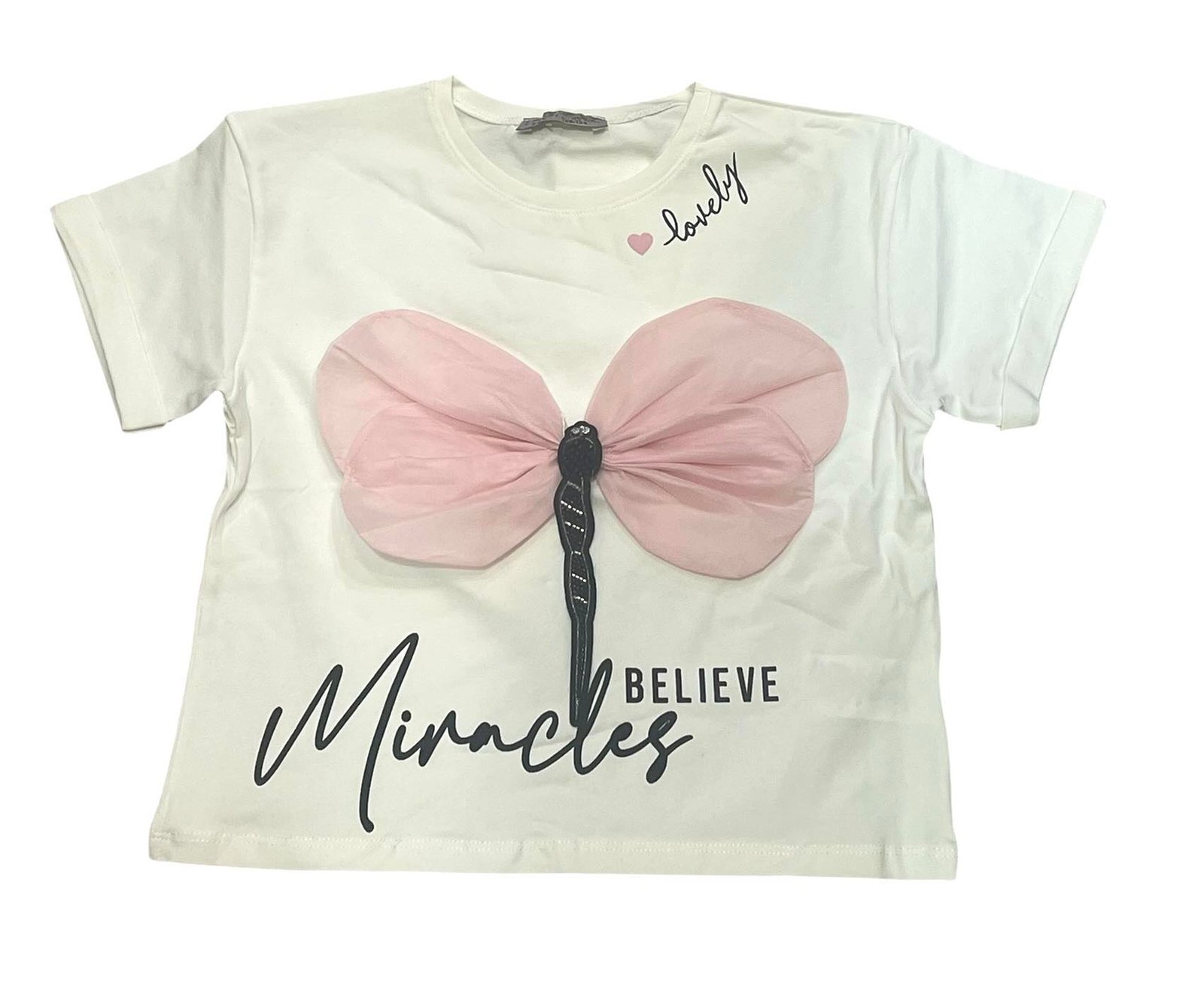 Crop μπλούζα από 100% βαμβακερό ζέρσεϊ ύφασμα, διακοσμημένη στο μπροστινό μέρος με δαντελένιο μοτίβο λιβελούλας μήκους 19 εκ. Ιδανική για κλασικό αλλά και σπορ ντύσιμο – ένα ιδιαίτερο boutique κομμάτι από τη συλλογή Little Star, limited edition.