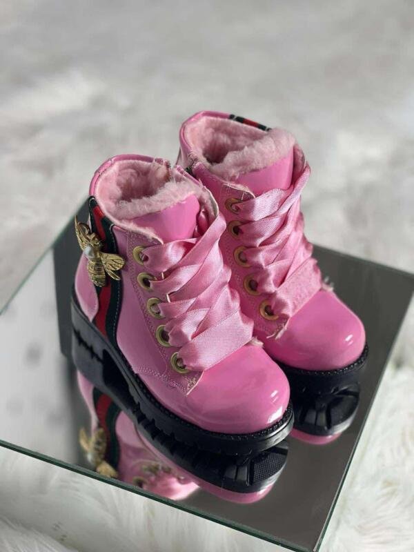 Γυαλιστερό δέρμα, εντυπωσιακή χρυσή μέλισσα με πέρλα στο πλάι και ζεστή γούνινη επένδυση για άνετα, στιλάτα ποδαράκια όλο τον χειμώνα.