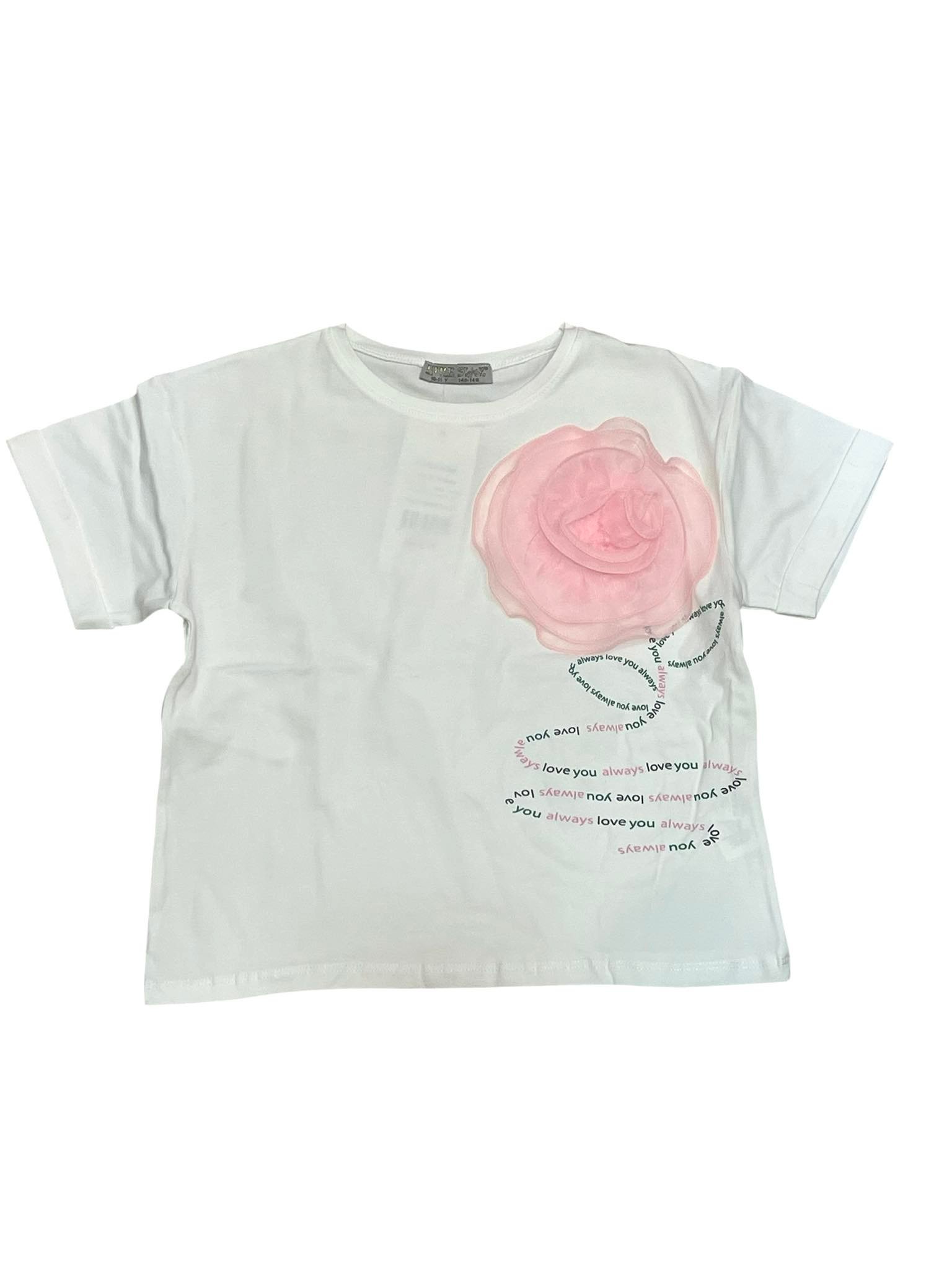 Καλοκαιρινή crop μπλούζα από 100% βαμβακερό ζέρσεϊ ύφασμα. Στο αριστερό επάνω μέρος διαθέτει διακοσμητικό τριαντάφυλλο από τούλι, διαστάσεων 10 εκ. Κατάλληλη για κλασικό και σπορ ντύσιμο. Limited Edition.
