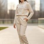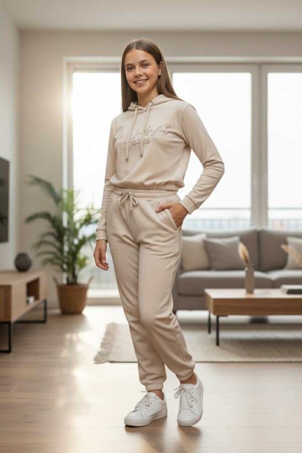 Το επάνω μέρος διαθέτει κορδόνι στη κουκούλα και διακριτική λαμπερή στάμπα στο μπροστινό μέρος, ενώ το παντελόνι έχει πρακτικές τσέπες και κορδόνι ρύθμισης στη μέση.