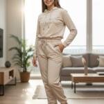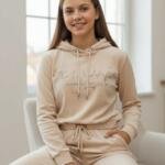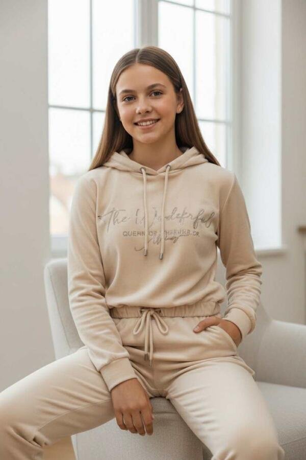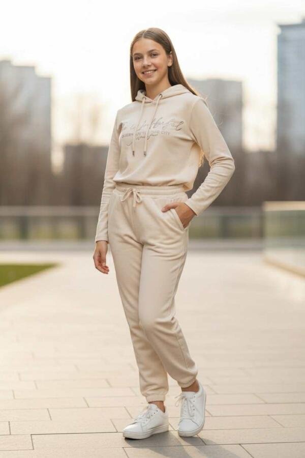 Άνετο και κομψό σετ φόρμας από βελούδο, με κουκούλα και λάστιχο στη μέση και στους αστραγάλους για τέλεια εφαρμογή.