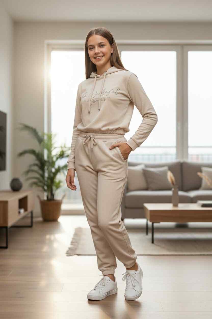 Άνετο και κομψό σετ φόρμας από βελούδο, με κουκούλα και λάστιχο στη μέση και στους αστραγάλους για τέλεια εφαρμογή.