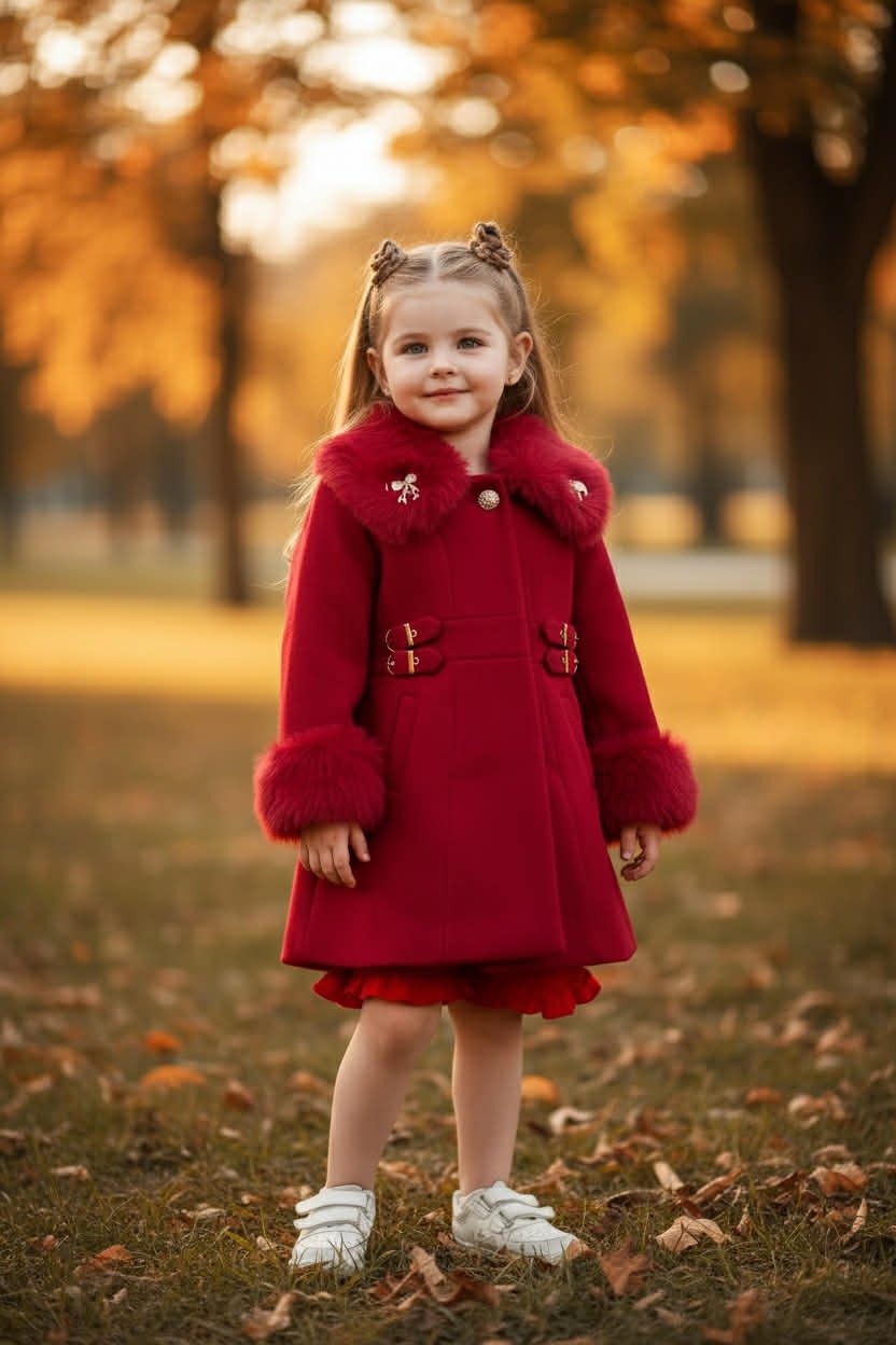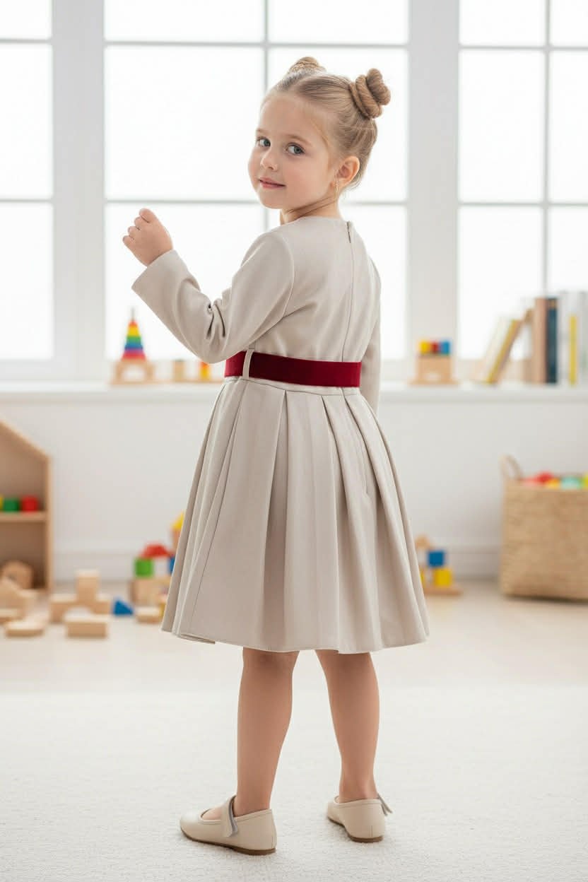 Limited Edition σετ δύο τεμαχίων με μπεζ φόρεμα σουέτ υφής και κόκκινο παλτό με γούνινες λεπτομέρειες. Ένα υπέροχο, ζεστό και κομψό σύνολο για γιορτές και ειδικές εμφανίσεις.
