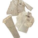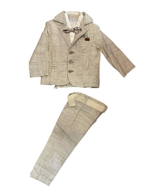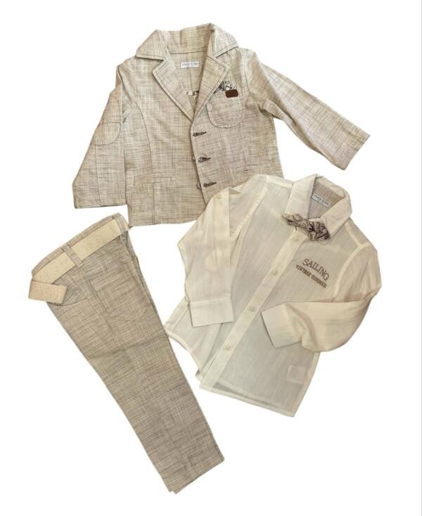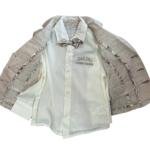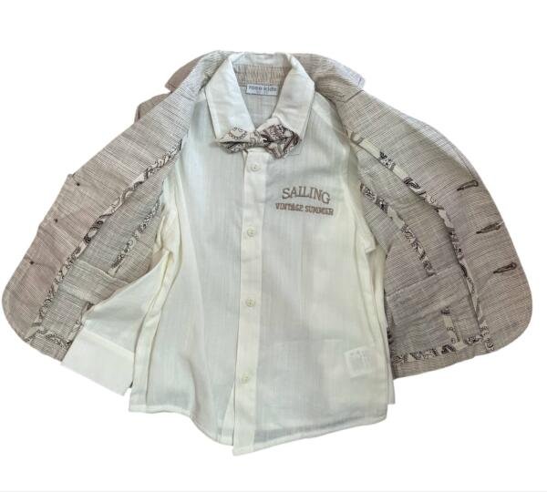 Ανάλαφρο βαμβακερό-λινό κοστούμι, ιδανικό για την άνοιξη και το καλοκαίρι. Περιλαμβάνει λεπτό βαμβακερό πουκάμισο με μακριά μανίκια, παπιγιόν και παντελόνι από το ίδιο ελαφρύ βαμβακερό-λινό ύφασμα. Το παντελόνι διαθέτει λάστιχο και κουμπί στη μέση για εύκολη ρύθμιση.