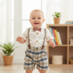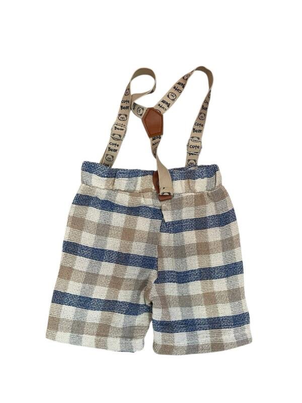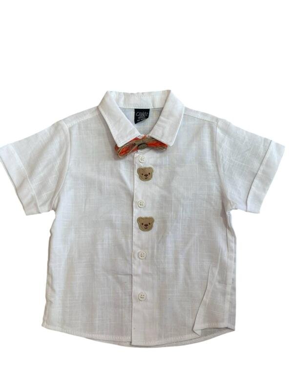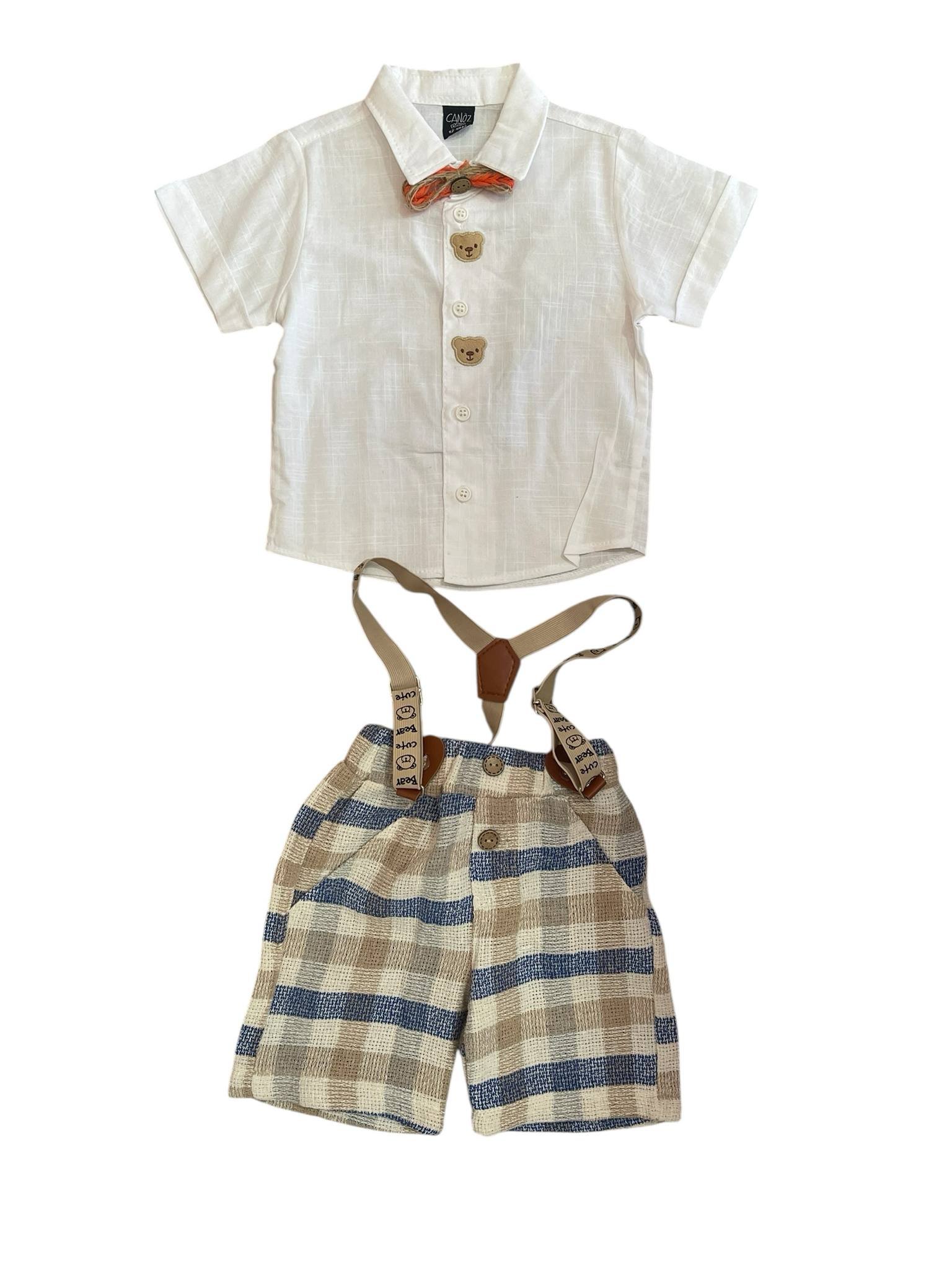 Σετ πουκάμισο και σορτς από 100% υποαλλεργικό λινό βαμβάκι. Περιλαμβάνονται επίσης τα αξεσουάρ: τιράντες παντελονιού σε σχήμα τριγώνου και παπιγιόν.