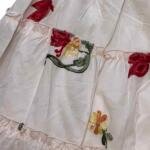 Το φόρεμα είναι φτιαγμένο από φυσικό βαμβάκι και λεπτό λινό ύφασμα, γι’ αυτό ειδικά στη ζέστη αφήνει το σώμα να αναπνέει και προσφέρει άνεση. Το σχέδιο ανοίγει κάτω από το στήθος και κατεβαίνει φαρδύ. Έχει φαρδιά και άνετη γραμμή. Είναι κατάλληλο τόσο για ιδιαίτερες περιστάσεις όσο και για καθημερινή χρήση. Το φόρεμα είναι διπλό, με φαρδιά γραμμή. Διαθέτει επάνω στρώση και από κάτω βαμβακερή φόδρα.