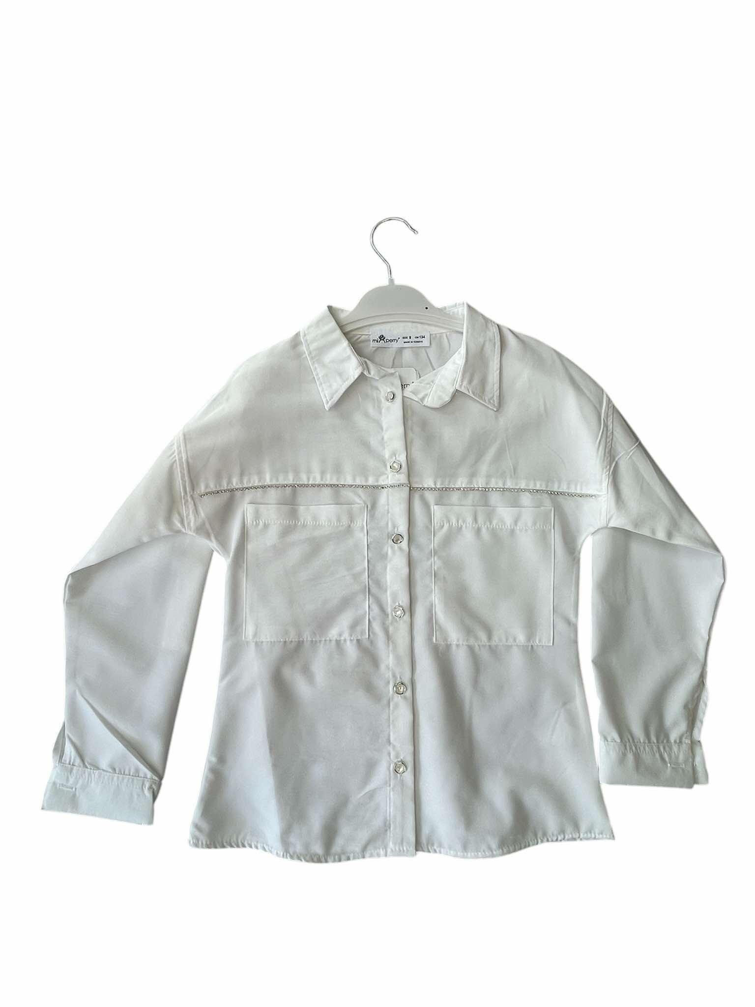 Λευκό πουκάμισο κλασικής γραμμής από βαμβάκι, με λεπτή διακοσμητική τρέσα από πέτρες στο μπροστινό μέρος του στήθους.Διαθέτει κουμπί στο μέσο του μανικιού για εύκολη αναδίπλωση.