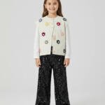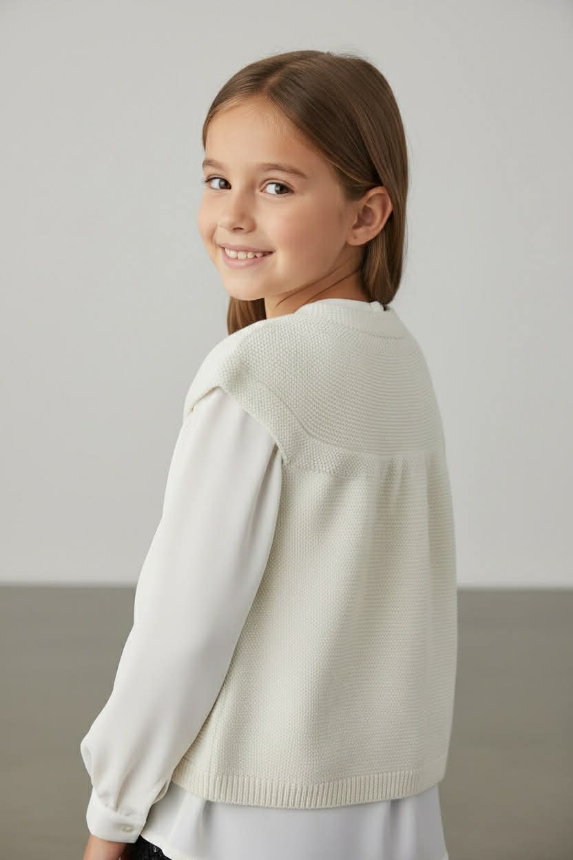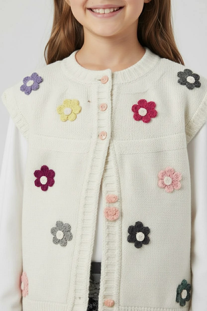 Πλεκτό γιλέκο για κορίτσι από 100% ακρυλικό, με απαλή αίσθηση και άνετη εφαρμογή. Η μπροστινή πλευρά είναι διακοσμημένη με τσόχινα λουλουδάτα μοτίβα, ενώ η πλάτη είναι μονόχρωμη/λιτή για εύκολο συνδυασμό με κάθε outfit. Κουμπώνει μπροστά και είναι ιδανικό για layering πάνω από μπλούζες ή πουκάμισα, για σχολείο, βόλτες και καθημερινές εμφανίσεις σε φθινόπωρο και χειμώνα.