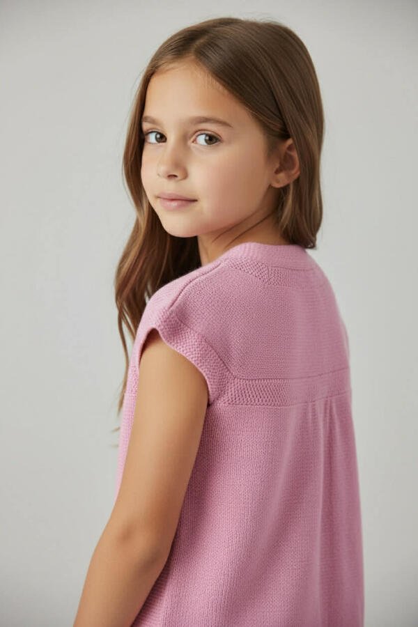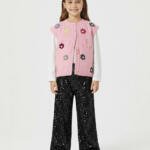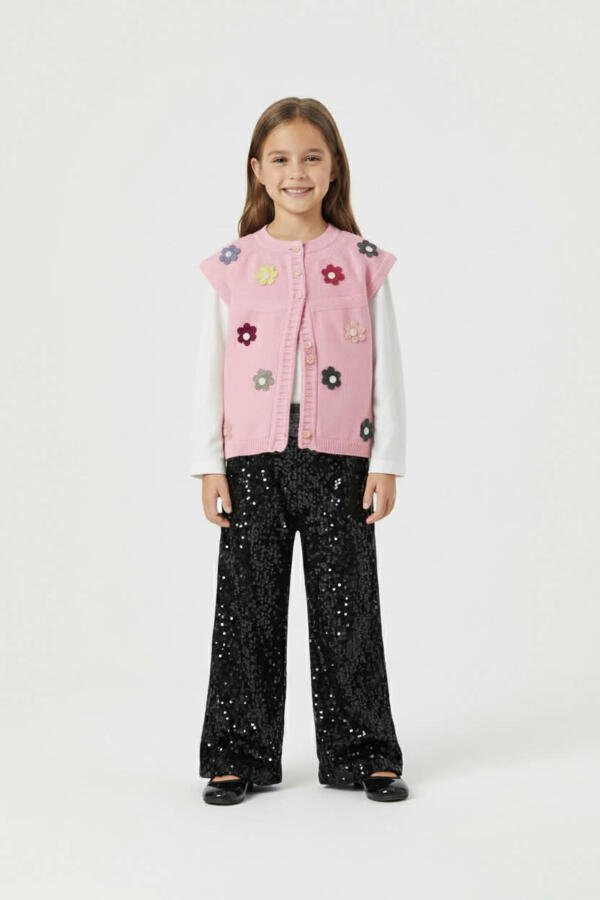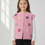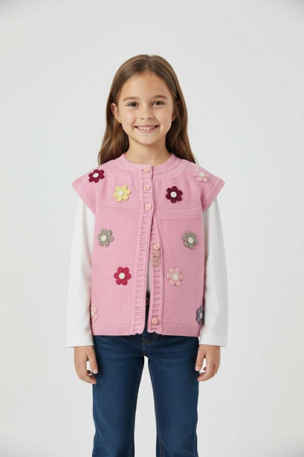 Πλεκτό γιλέκο για κορίτσι από 100% ακρυλικό, με απαλή αίσθηση και άνετη εφαρμογή. Η μπροστινή πλευρά είναι διακοσμημένη με τσόχινα λουλουδάτα μοτίβα, ενώ η πλάτη είναι μονόχρωμη/λιτή για εύκολο συνδυασμό με κάθε outfit. Κουμπώνει μπροστά και είναι ιδανικό για layering πάνω από μπλούζες ή πουκάμισα, για σχολείο, βόλτες και καθημερινές εμφανίσεις σε φθινόπωρο και χειμώνα.