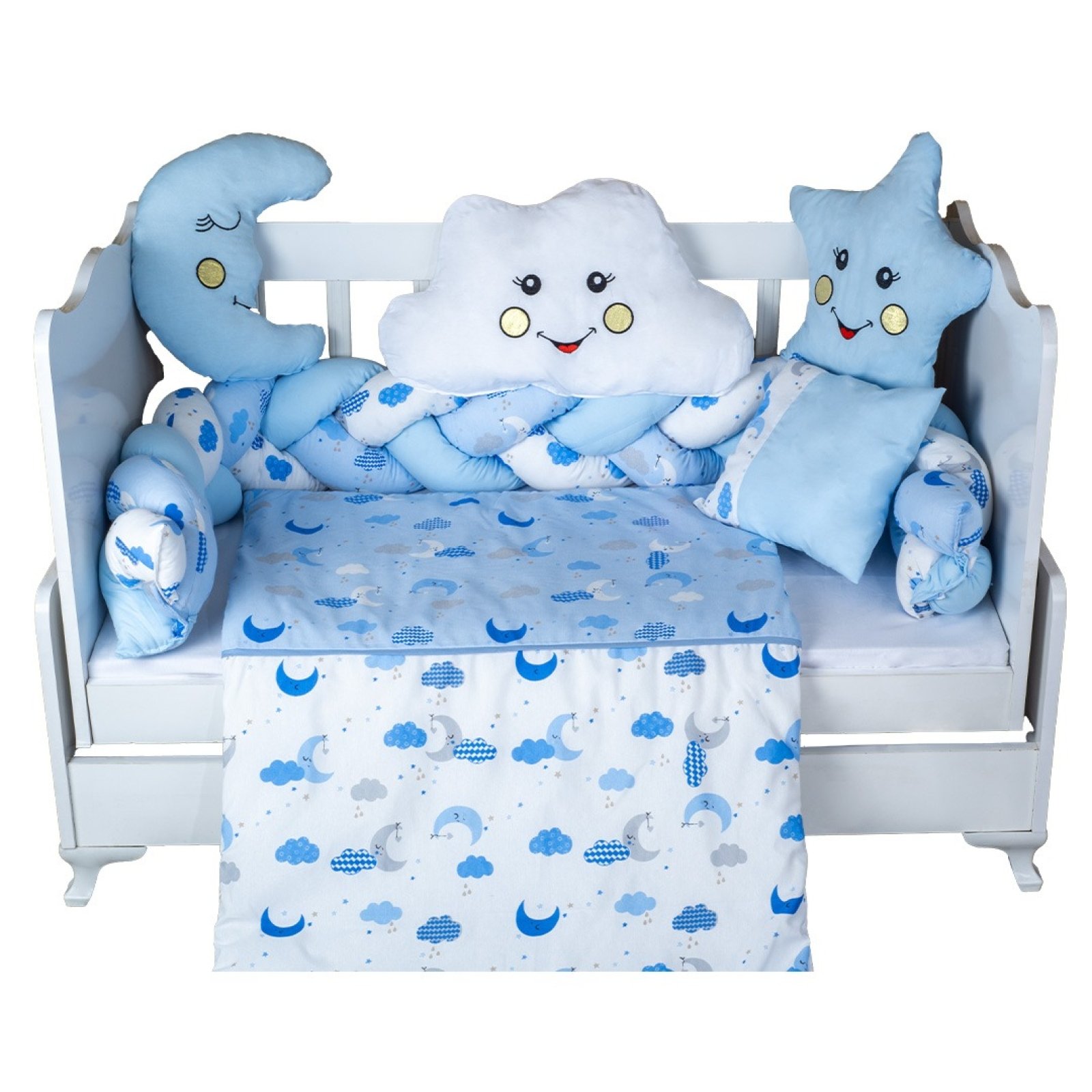 Δημιουργήστε ένα γλυκό και ονειρικό περιβάλλον ύπνου για το μωρό σας με αυτό το σετ κούνιας σε μπλε-λευκές αποχρώσεις, με σχέδια σύννεφα και φεγγαράκια και χαριτωμένα μαξιλαράκια-φιγούρες.