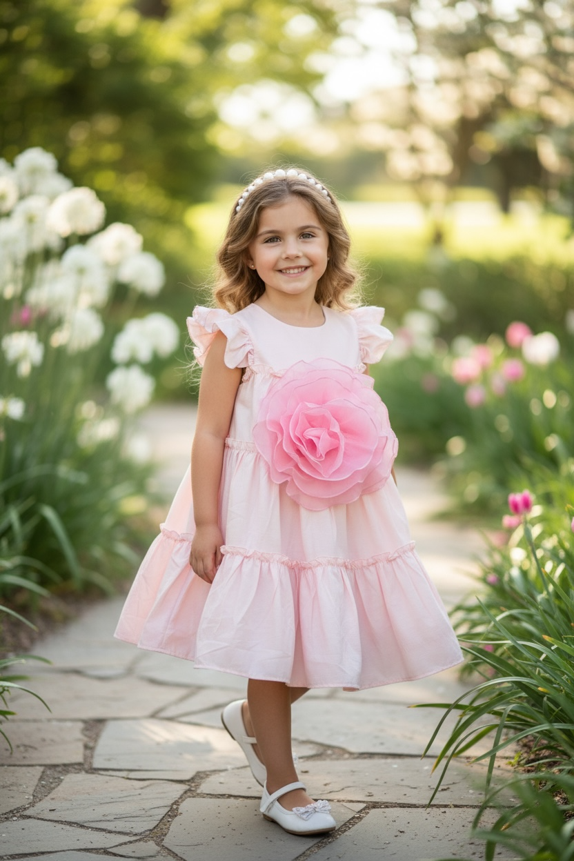 Το φόρεμα είναι κατασκευασμένο από 100% βαμβάκι και λινό. Έχει φαρδιά, σε στρώσεις γραμμή από πάνω προς τα κάτω, προσφέροντας άνετη εφαρμογή για τους καλοκαιρινούς και ανοιξιάτικους μήνες. Το 3D τούλινο λουλούδι στο μπροστινό μέρος του φορέματος, πλάτους 22 cm, προσφέρει μια πολύ κομψή εμφάνιση. Είναι ένα boutique φόρεμα που μπορεί να φορεθεί τόσο ως επίσημο όσο και ως casual.