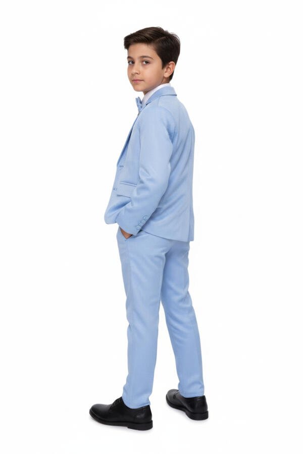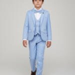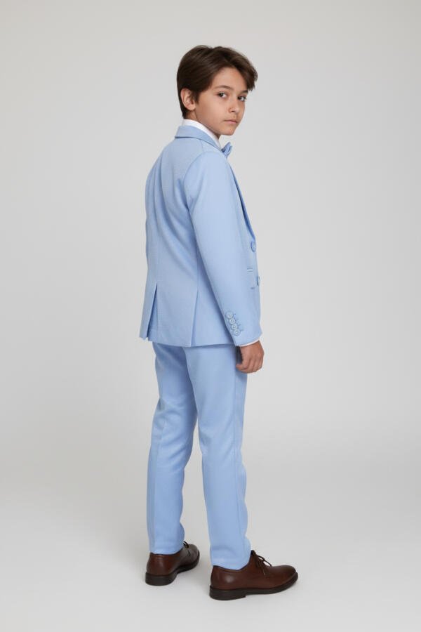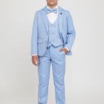 • Χρώμα: Σακάκι γαλάζιο (με μπλε λεπτομέρειες) + παντελόνι σκούρο μπλε (navy) + πουκάμισο λευκό