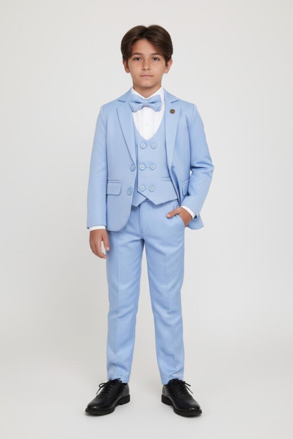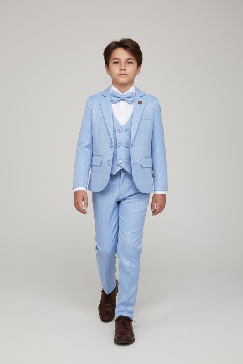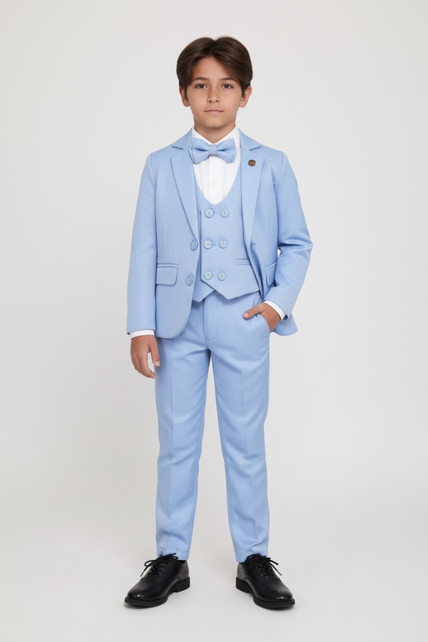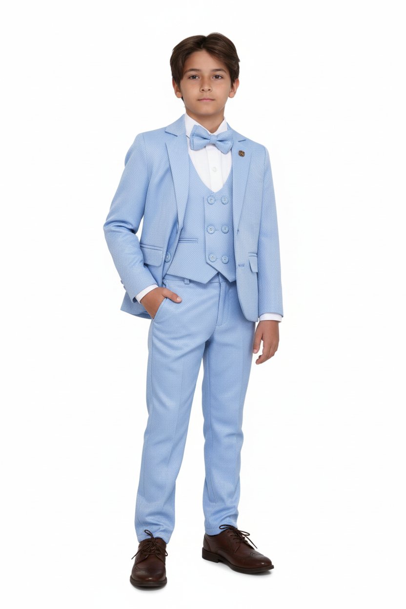 Elegant σετ κοστουμιού 5 τεμαχίων για αγόρι. Περιλαμβάνει σακάκι, γιλέκο, πουκάμισο, παντελόνι και παπιγιόν.
