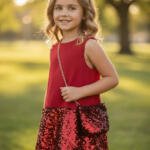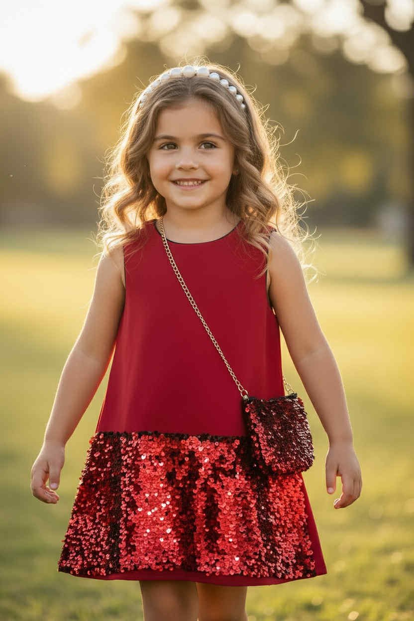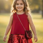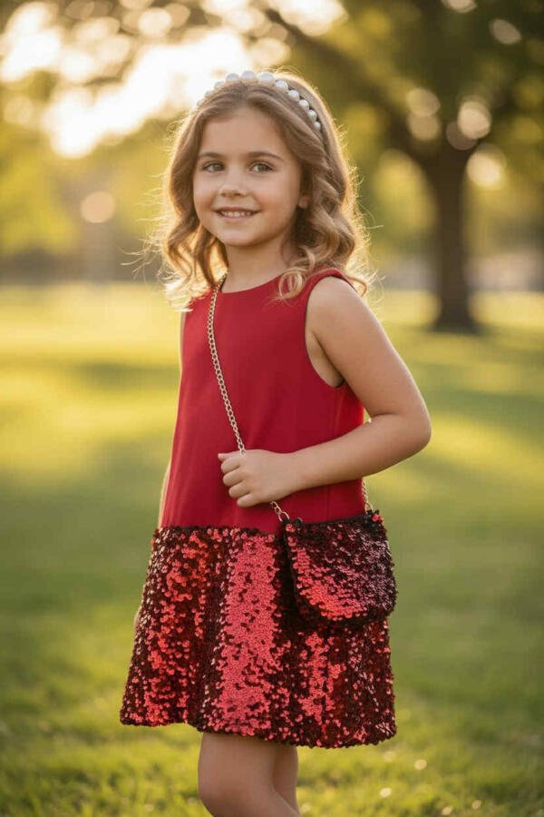 Το κάτω μέρος του φορέματος είναι διακοσμημένο με γκλίτερ, ενώ η πίσω πλευρά είναι από απλό ύφασμα. Το αξεσουάρ τσάντα περιλαμβάνεται στο προϊόν.
