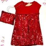 Το μπροστινό μέρος του φορέματος, μέχρι την περιοχή του στήθους, είναι διακοσμημένο με γκλίτερ, ενώ η πίσω πλευρά είναι από απλό ύφασμα. Συνοδεύεται από ένα τσαντάκι διακοσμημένο επίσης με γκλίτερ ως αξεσουάρ.