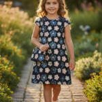 Το μπροστινό μέρος του φορέματος είναι διακοσμημένο με γκλίτερ πάνω σε λουλούδια, ενώ η πίσω πλευρά είναι από απλό ύφασμα.