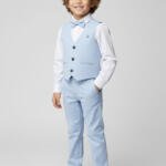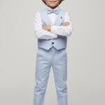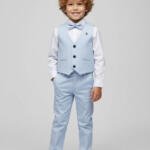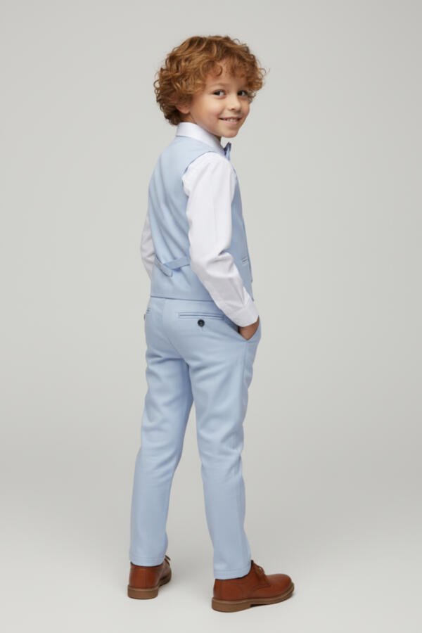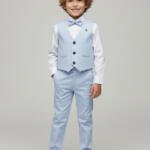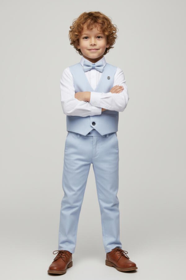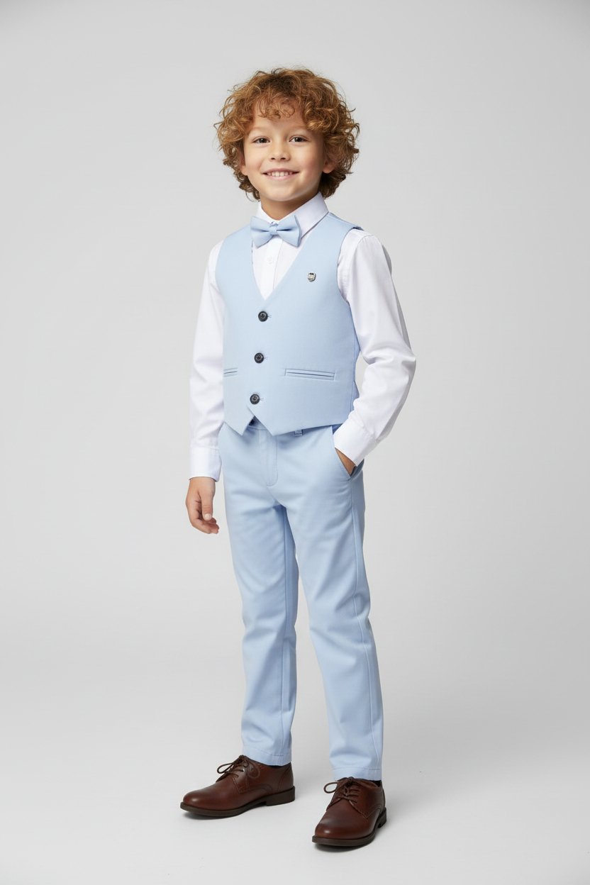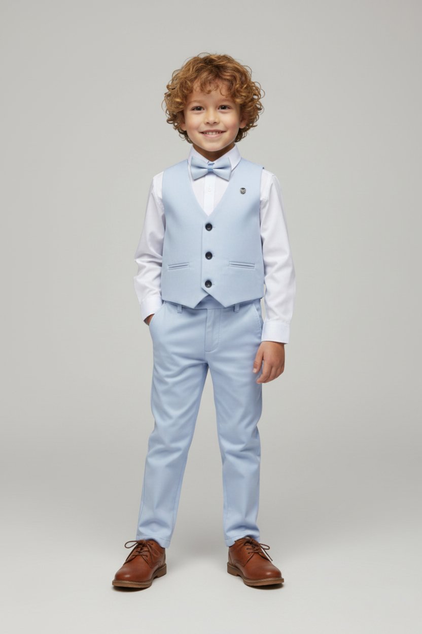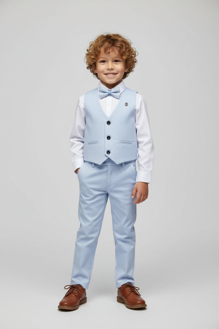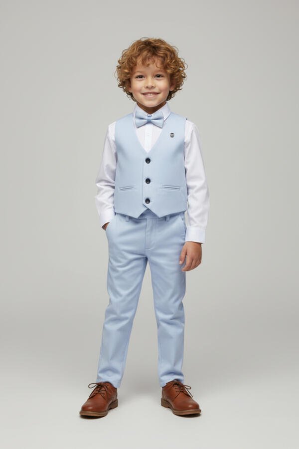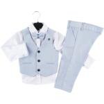 Κομψό σετ 4 τεμαχίων για αγόρι, ιδανικό για βάπτιση, γάμο και επίσημες εκδηλώσεις. Περιλαμβάνει γιλέκο, παντελόνι, πουκάμισο και παπιγιόν.